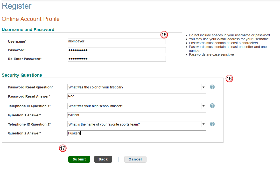 Step 15-17: Create Username and Password. Select 3 security questions from the dropdown. These questions will be how the Authorized Party is authenticated if they call with questions about the account or if they need to reset their password. Complete the registration process by clicking Submit.