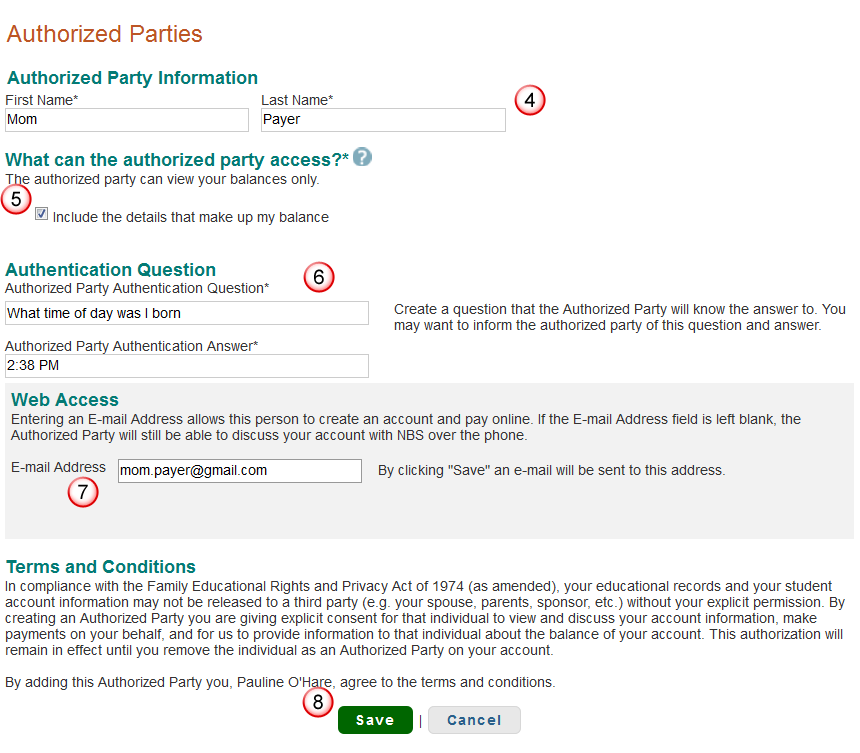 Step 4 -8: Enter the name of the person. Select the level of access this person has to your Student Account (you may allow them to see the details of your current balance and statement or you may allow them to only see the balance). Create an authentication question that only you and the Authorized Party will know. The Authorized Party must answer the question correctly to link to your account. Enter the Authorized Party email address. This is where the invitation to become your Authorized Party will be sent. Read the terms and conditions and save the information. Once saved, the invitation is sent to the email address provided.