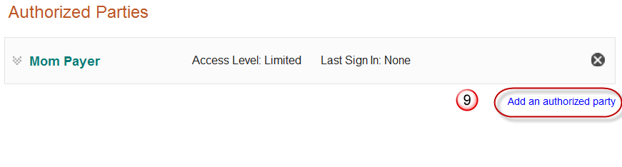 Step 9: Add another Authorized Party. You can have unlimited Authorized Parties on your account.