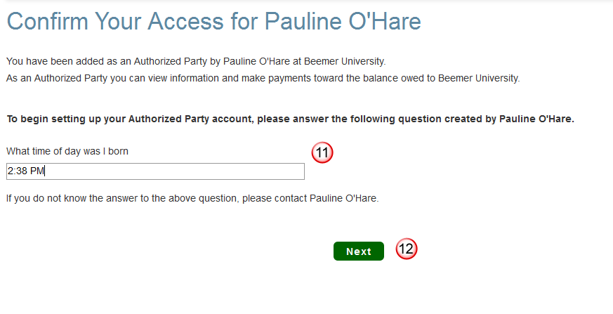 Step 11 and 12: Authorized Party must answer the authentication question entered by the student correctly. Once the question has been answered continue to the next step of registration.