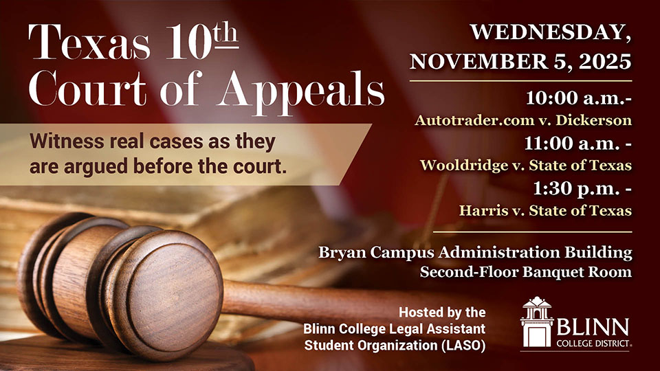 The Blinn College District invites students and the public to witness precedent-setting appellate cases when the Texas 10th Court of Appeals holds session in the Blinn College-Bryan Campus Administration Building (map) on Wednesday, Nov. 5.