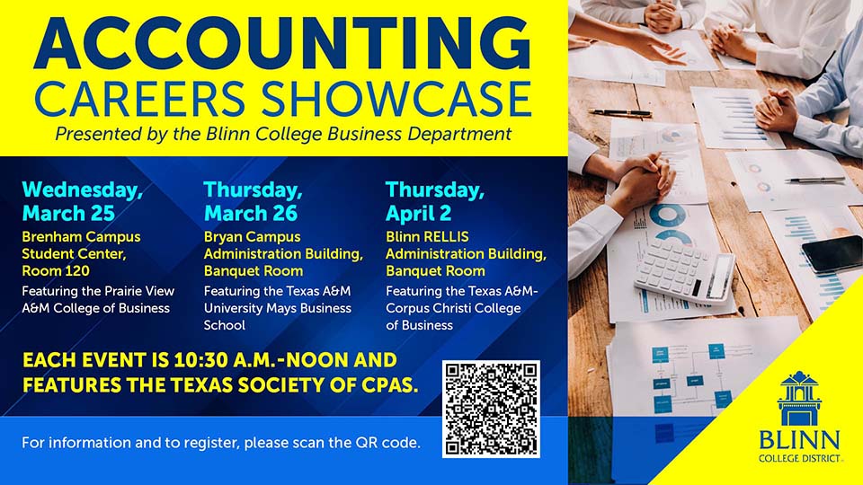 The Blinn College District will host a series of Accounting Career Showcase events this spring on the Brenham, Bryan, and RELLIS campuses, providing students with opportunities to explore careers in accounting and connect with professionals in the field.